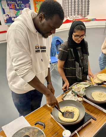 Since September 2023, a cooking group for asylum seekers and refugees living locally has been running in partnership with St Albans Cathedral. Each month we make dishes native to the countries the participants have come from, and from January 2024 we will be serving these to the public in our Sanctuary Suppers project.